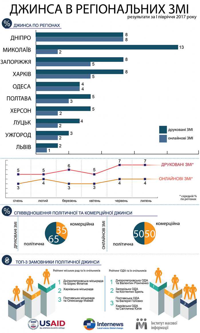 "Средний уровень джинсы в региональных печатных СМИ в среднем за полгода составил 6%, а в онлайн-СМИ - 3% от общего количества материалов. Меньше всего таких материалов во Львове (2% в печатных и 1% в интернет-СМИ)", - говорится в сообщении.