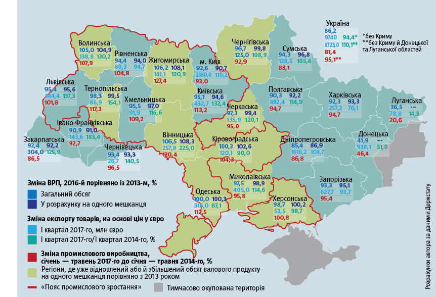 «При порівнянні обсягів українського експорту товарів у євро за перші квартали 2017-го та 2014-го років виявляється, що загалом по країні, але без урахування Донецької та Луганської областей, він зріс із €7,92 млрд до €8,72 млрд, тобто на 10,1%. Більшість регіонів успішно адаптувалися до світової кон’юнктури. Експорт товарів із Вінницької області зріс на 125%, Івано-Франківської — на 83,4%, Тернопільської — 54,1%, Чернівецької — 40,5%, Львівської — 37,3%, Київської — 32,4%, Волинської — 30,2%, Закарпатської — 25,9%. Ще в шести регіонах (Хмельницька, Житомирська, Черкаська, Київ, Полтавська, Миколаївська) зростання становило 10–20%. Від 5 до 9% за означений період збільшився експорт із Дніпропетровської, Сумської та Чернігівської областей.