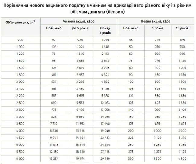 Так, за основу будет браться базовая ставка в 50 евро для машин на бензиновом двигателе и 75 евро для машин на дизельном двигателе. Для расчета акциза, эту сумму нужно будет умножить на количество лет с года, следующего после производства машины и на коэффициент объема двигателя (объем двигателя в кубических сантиметрах, разделенный на 1000).