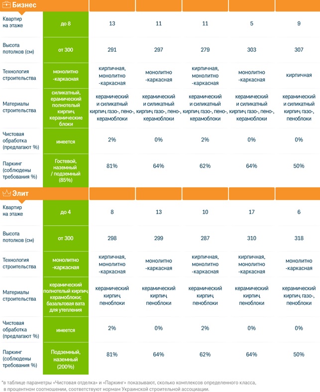 Основными характеристиками в соответствии с нормами выступили: количество квартир на одном этаже (до 12 квартир), высота потолков (от 250 см), технология строительства (кирпичная, монолитно-каркасная). Также дом должен быть построен из керамического или силиконового кирпича, или газоблоков. Иметь в наличии чистовую отделку стен и парковочные места (включительно 50% гостевого).