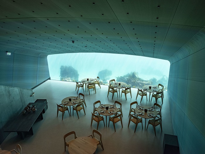 Клиенты входят в ресторан с берега через проход с деревянными панелями и спускаются по длинной дубовой лестнице. Внутри центральное место занимает гигантское плексигласовое подводное окно с панорамным видом на подводный мир.