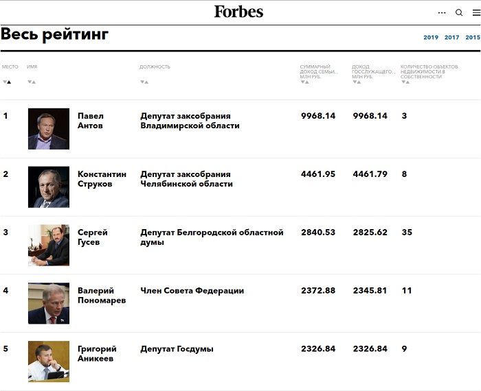 Возглавил рейтинг доходов госслужащих и депутатов по версии Forbes Павел Антов – депутат законодательного собрания Владимирской области и основатель группы компаний "Владимирский стандарт". По данным Forbes, его официальный доход за 2018 год составил около 10 миллиардов рублей (157 млн долларов).