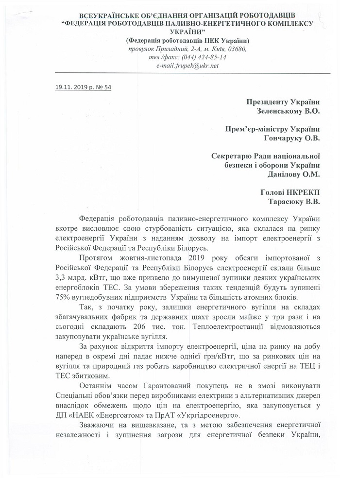 «Протягом жовтня-листопада 2019 року обсяги імпортованої з Російської Федерації та Республіки Білорусь електроенергії склали більше 3,3 млрд. кВтг, що вже призвело до вимушеної зупинки деяких українських енергоблоків ТЕС. За умови збереження таких тенденцій, будуть зупинені 75% вугледобувних підприємств України та більшість атомних блоків», - зазначається в зверненні.