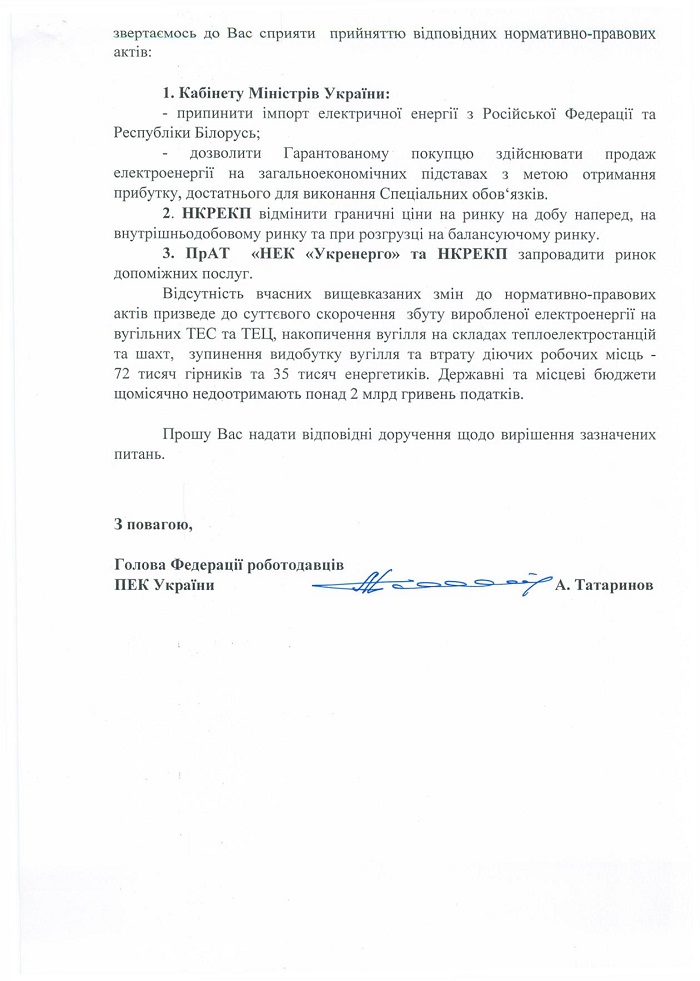 Автори звернення також повідомляють, що з початку року, залишки енергетичного вугілля на складах збагачувальних фабрик та державних шахт зросли майже у три рази і на сьогодні складають 206 тисяч тон, а теплоелектростанції відмовляються закуповувати українське вугілля. Окрім того, спровоковане зростанням імпорту російського струму падіння цін на ринку «на добу наперед» робить виробництво електроенергії на ТЕЦ і ТЕС збитковим.