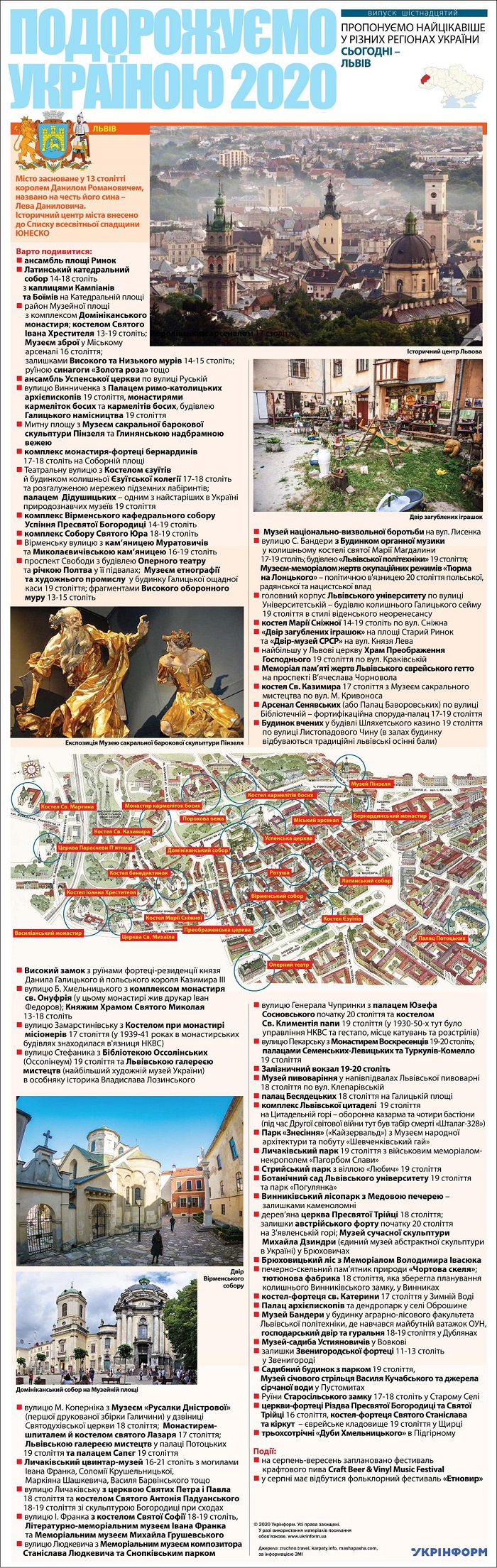 В выпуске 16 - Львов, исторический центр которого внесен в Список всемирного наследия ЮНЕСКО. Предыдущие выпуски инфографического цикла "Путешествуем по Украине" от Укринформа.