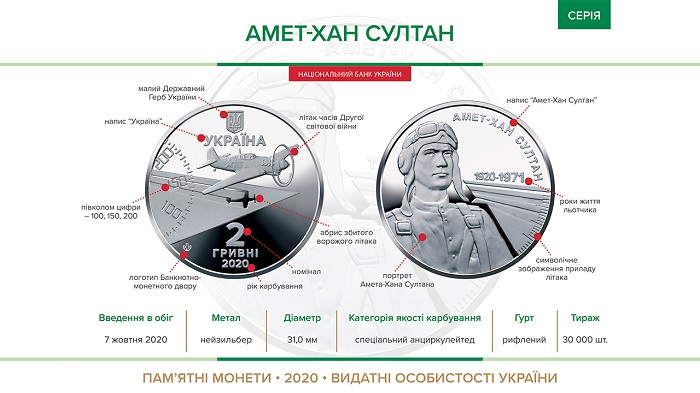 Согласно сообщению, монета посвящена 100-летию со дня рождения одного из самых известных военных летчиков-асов времен Второй мировой войны, испытателю, дважды Герою Советского Союза, национальному герою крымскотатарского народа - Амет-Хану Султану.