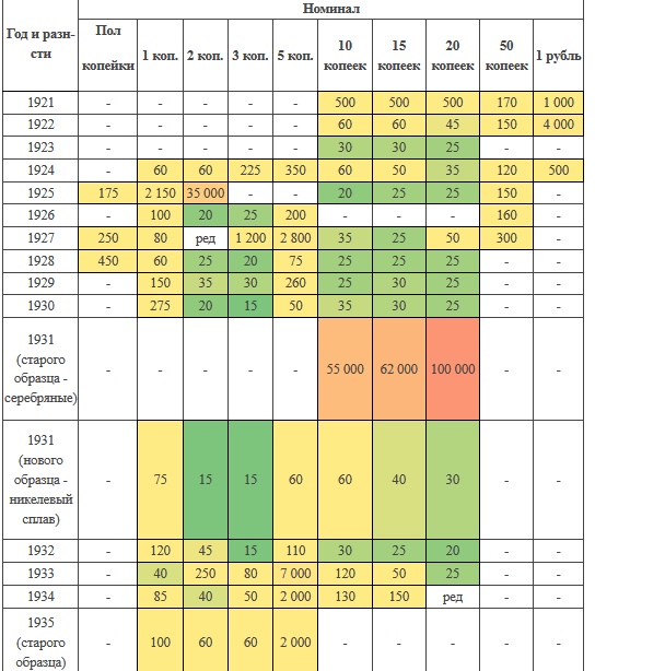 “прочерк“ - в этом году монеты данного номинала не выпускались