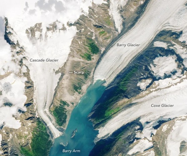 Анализ спутниковых снимков показывает, что по мере того, как ледник Барри отступает от Барри-Арм из-за продолжающегося таяния, на склоне горы над ним появляется большой каменистый шрам, называемый уступом.