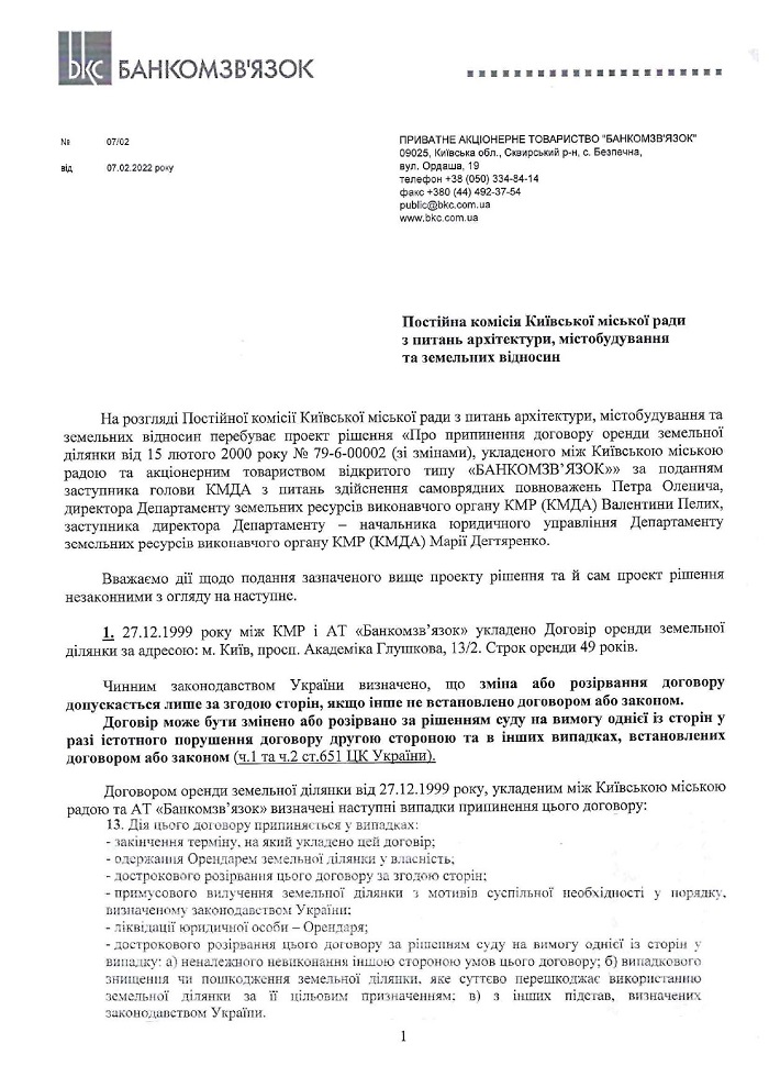 Ділянка з нежитловими будинками, про яку йдеться, розташована на проспекті Академіка Глушкова, 13/2. Як зазначають юристи «Банкомзв’язку», у 1999 році Київрада передала її в оренду компанії на 49 років. У заяві також зазначається, що українське законодавство не дає змоги розірвати в односторонньому порядку договір без судового рішення або низки юридичних обставин, що не настали.