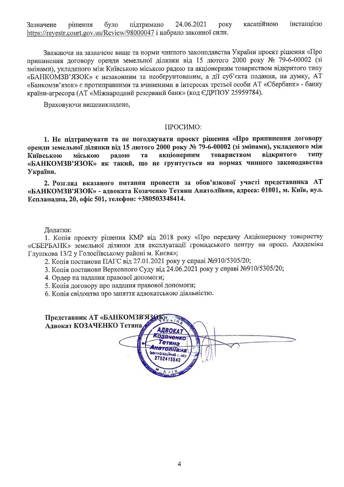 Юристи «Банкомзв’язку» зазначають, що у 2018 році Петро Оленич, на той момент – директор земельного департаменту, вже подавав Київраді подання на розірвання договору оренди цієї земельної ділянки та подальшу передачу її в оренду «Сбербанку», проте міськрада не підтримала його. Більше того, у 2019 році Київрада заборонила передавати комунальне майно та землю у власність чи користування юрособам із російським капіталом.