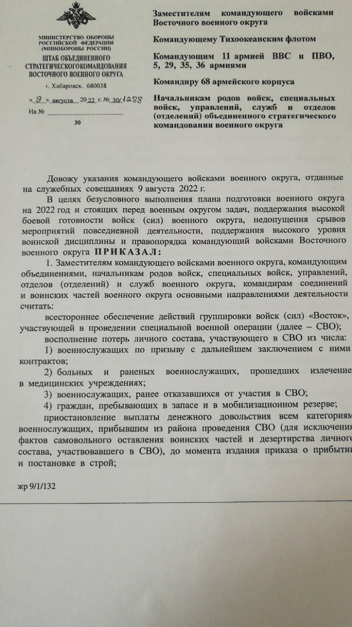 Згідно з наказом командувача Східного військового округу, поповнення втрат буде здійснюватися за рахунок наступних категорій росіян: