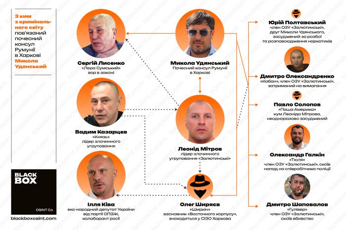 З ким з кримінального світу пов’язаний почесний консул Румунії в Харкові Микола Удянський. Інфографіка BlackBox OSINT