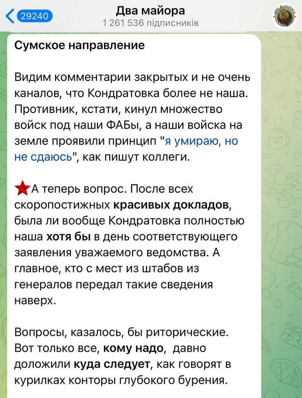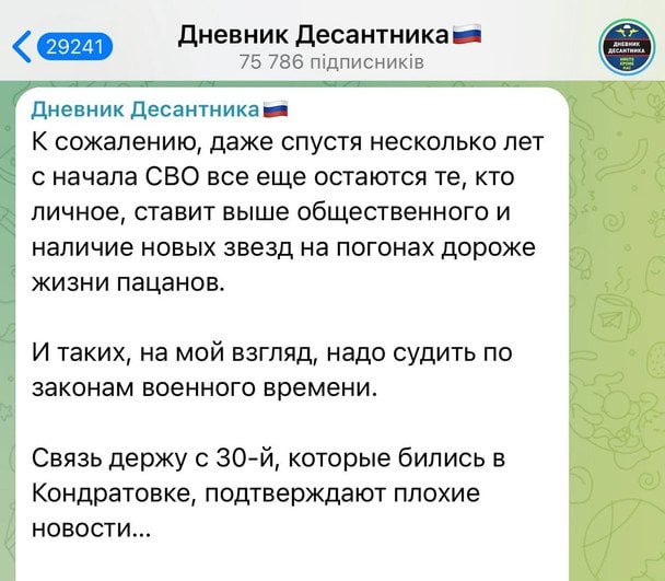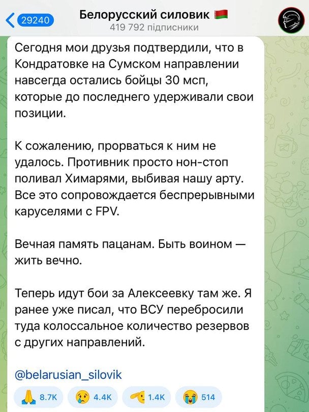 Повідомляється, що армія РФ відступила з Кіндратівки з великими втратами. Великих втрат там зазнала російська 30-та окрема мотострілецька бригада окупантів.