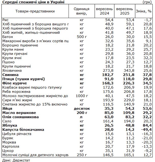 Десяток яєць у вересні 2025 року коштував у середньому 54,2 грн – на 53% більше, ніж роком раніше. Ціни на свинину піднялися на 38%, на куряче філе – майже на 35%, а на тушки курки – на 30%. Яблука також значно подорожчали – до 48,8 грн/кг, тобто майже на 84%.