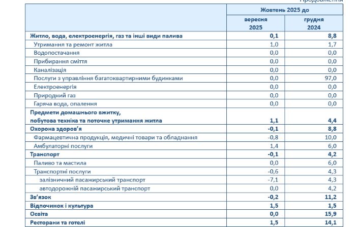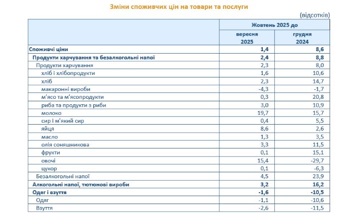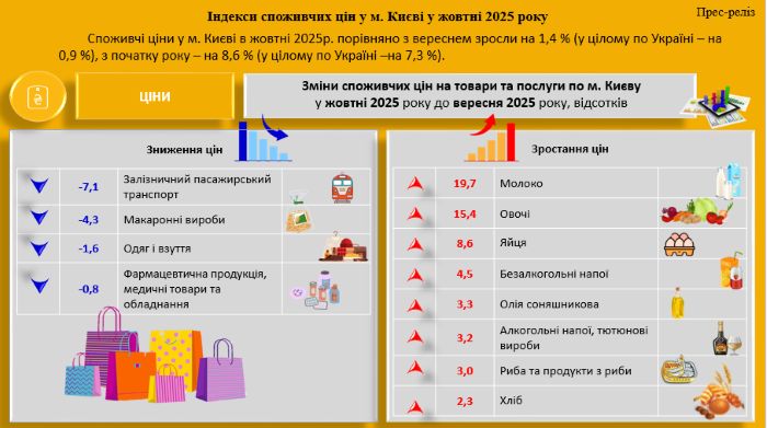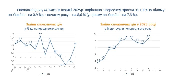 Споживчі ціни у м. Києві в жовтні 2025р. порівняно з вереснем зросли на 1,4% (у цілому по Україні - на 0,9%), з початку року — на 8,6% (у цілому по Україні -на 7,3%).