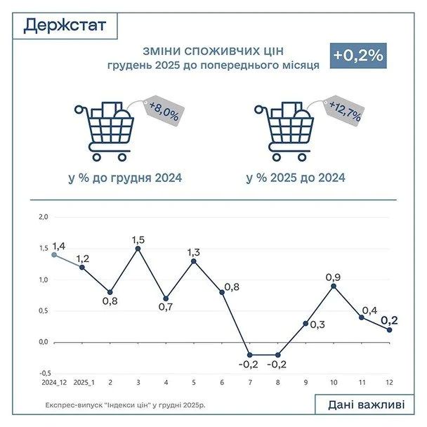 У грудні 2025 року темпи зростання споживчих цін сповільнилися до 0,2% за місяць, проте в річному вимірі інфляція становить 8,0%. Пише ТСН. Про це повідомляють Контракти.UA.