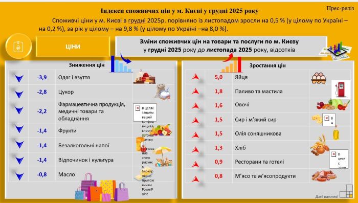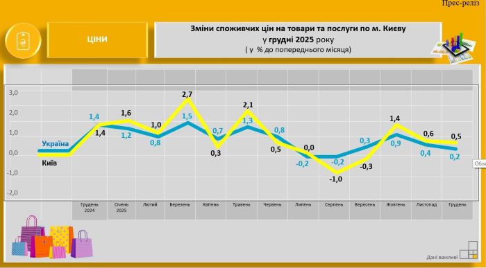 Таким чином, грудень у Києві відзначився помірним зростанням споживчих цін, але окремі категорії товарів — насамперед продукти харчування — продемонстрували суттєві коливання.