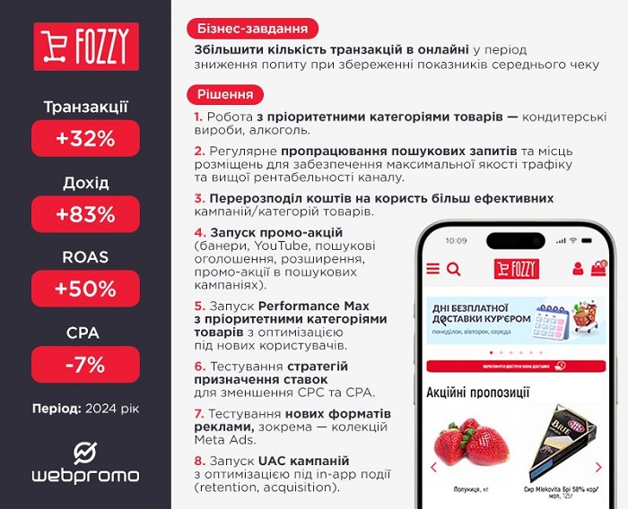 Об'єктом просування став Fozzy Shop — онлайн-супермаркет з послугою доставки продуктів у 7 містах України, який щороку відвідує понад 5 млн покупців.