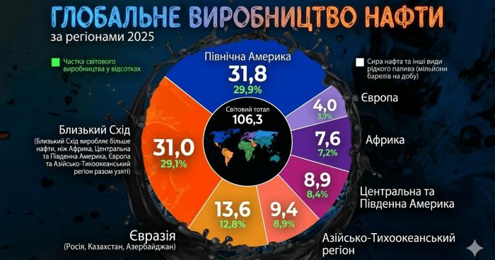 2025 року світовий видобуток нафти становив близько 106,3 мільйона барелів на добу, причому майже 60% цього обсягу припадає лише на два регіони — Північну Америку та Близький Схід. Водночас через воєнні дії та фактичне блокування Ормузької протоки світовий ринок готується до серйозних цінових коливань 2026-го. Пише ТСН. Про це повідомляють Контракти.UA.