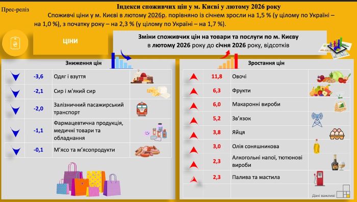 Споживчі ціни у столиці в лютому 2026 року зросли на 1,5% порівняно із січнем. Цей показник виявився вищим за середній рівень інфляції по Україні, який становив 1%.