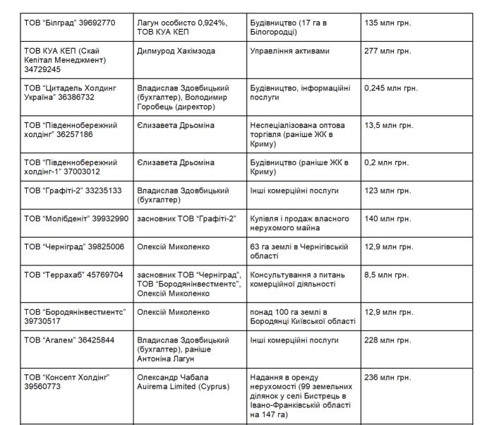 Поки нічого не міняється і в житті інших партнерів-“фунтів” Лагуна, імена яких уже неодноразово згадувалися в публікаціях в медіа: Вадим Сергієнко, Олексій Миколенко, Геннадій Литвин та Олександр Чабала, а також колишня юристка “Дельта банку” Ганна Гуцалюк, на яку записано частину аграрних бізнесів Лагуна. Одразу після запровадження санкцій щодо “голови клану”, Сергієнко переписав інвестфонд Лагуна – КУА “Скай Кепітал менеджмент” (зараз КУА КЕП) на громадянина Таджикістану Дилмурода Хакімзоду. Так само на цього громадянина було переписано ТОВ “Білград” (17 га під забудову у Білогородці) та ТОВ “Крем-1” (29 га під забудову у Білогородці, ділянки перебували у заставі Укрексімбанку). Хакімзода на папері володіє понад сотнею різних бізнесів у найрізноманітніших галузях, проте назвати це бізнес-групою не вийде: йдеться, ймовірно, про звичайне “списання” компаній з боргами перед контрагентами і бюджетом на підставну особу, яку навряд чи вдасться “дістати” українським правоохоронним органам. За аналогічною схемою, до слова, компанію Антоніни Лагун – ТОВ “Агалем” з активами майже на 230 млн грн. – було переписано на громадянина Узбекистану Уміджона Тешабаєва.