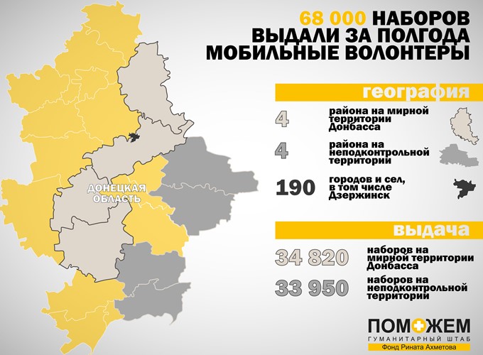 Главное, благодаря чему мы добились такого результата – это команда Штаба. Не хватает слов, чтобы выразить благодарность всем волонтерам, которые на неподконтрольных территориях и в селах на линии соприкосновения, где периодически возобновляются обстрелы, помогают людям. И делают это, не задумываясь о риске для собственной жизни. А также мы благодарны нашим партнерам, которые, как на неподконтрольных, так и мирных территориях Донбасса предоставляют помещения для наших пунктов выдачи, заботясь о мирных жителях.