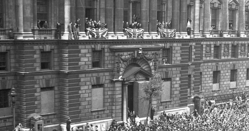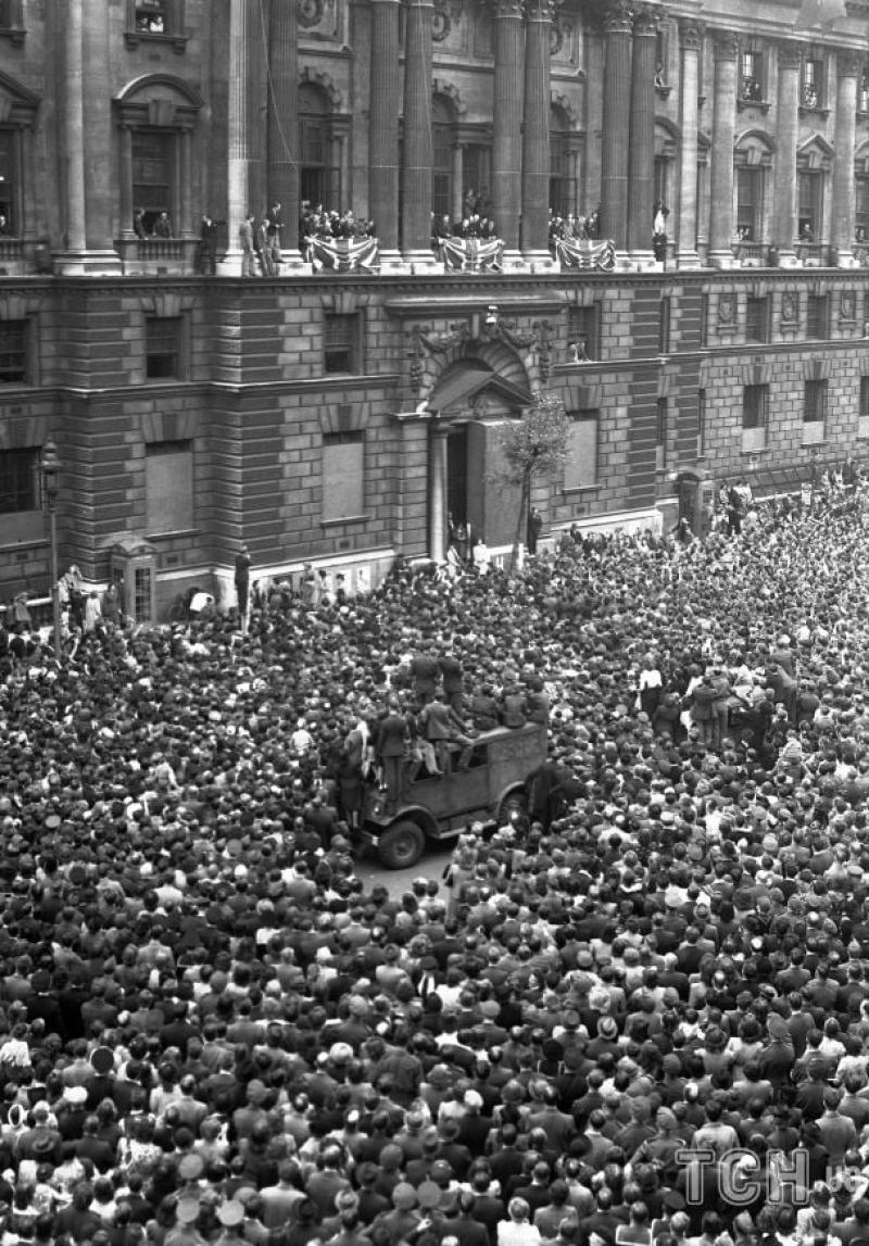 Як святкували День Перемоги, можна побачити на архівних фото. Після того, як напередодні було підписано Акт капітуляції Німеччини, 8 травня 1945 року, у багатьох містах Європи було проведено широкомасштабні урочистості. У Лондоні величезна кількість людей зібралася на Трафальгарській площі та біля Букінгемського палацу. Пише ТСН. Про це повідомляють Контракти.UA. На знаменитому балконі підданих вітала королівська родина та прем'єр-міністр Великої Британії Вінстон Черчилль. На фото ми бачимо молоду принцесу Єлизавету (майбутню королеву Єлизавету II), королеву Єлизавету (Єлизавету Боуз-Лайон), Вїнстона Черчилля (у центрі), короля Георга VI і балкон Букінгемського палацу в Лондоні, в День Перемоги 8 травня 1945 року. День Перемоги у Британії 8 травня 1945 року / © Associated Press