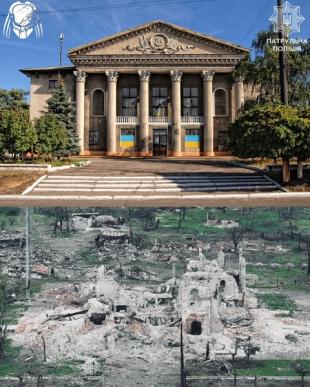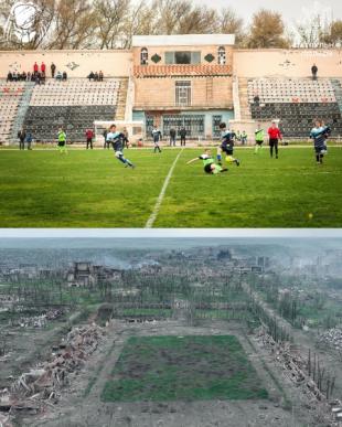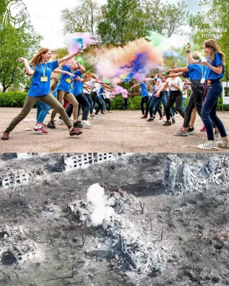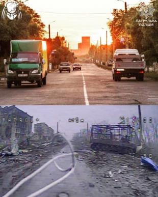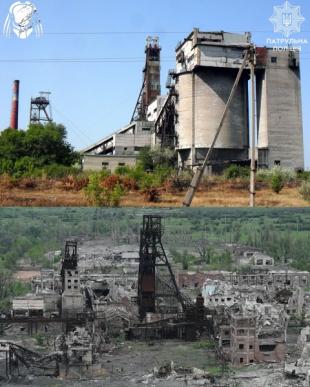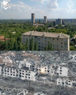 На знімках показано Торецьк до та після російського вторгнення. Зокрема, стадіон "Авангард", шахту імені святої Матрони, палац культури "Україна", Будинок творчості, багатоповерхівки та вулиці, якими їздив громадський транспорт.