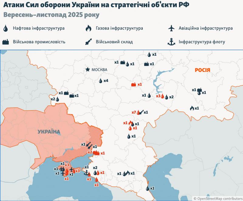 Українські захисники цієї осені атакували понад 50 об'єктів паливної та військово-промислової інфраструктури Росії. З'явилися знімки наслідків таких ударів. Про це пише РБК-Україна з посиланням на "Радіо Свобода".Про це повідомляють Контракти.UA. Як пише видання, такої великої кількості успішних ударів за сезон в українських захисників ще не було. "Радіо Свобода" за допомогою супутникових зображень створила карту уражених стратегічних об'єктів Росії. На ній позначено військові об'єкти, нафтопереробні та газопереробні заводи, нафтові бази та термінали. Зокрема, українським воїнам вдалося уразити: "Саранський механічний завод" "Саранський механічний завод" - одне з підприємств корпорації "Ростех", яка є ключовим виробником зброї та боєприпасів для окупантів. Атака на завод відбулася в ніч на 22 жовтня. Супутникові знімки свідчать про те, що було пошкоджено дах однієї з будівель заводу. Нафтовий термінал у Туапсе Порт у Туапсе - один із найважливіших для Росії в Чорному морі. За даними Інституту Чорноморських стратегічних досліджень, Росія перевозить через нього техніку, боєприпаси, паливо і не тільки. У ніч на 1 листопада українські захисники вдарили по нафтовому терміналу в Туапсе. На супутникових знімках можна помітити, що був "приліт" по нафтовому трубопроводу. Також було пошкоджено один із танкерів, який стояв у порту в момент атаки українських воїнів. Морський нафтовий термінал у Феодосії Морський нафтовий термінал у Феодосії - найбільший у Криму за обсягами перевалки нафтопродуктів. Тільки восени українські захисники тричі били по морському нафтовому терміналу у Феодосії в тимчасово окупованому Криму. Згідно із супутниковими знімками, було знищено та пошкоджено 13 резервуарів із паливом. Будівлі "Транснафти" і "Лукойлу" Наприкінці вересня українські воїни завдавали ударів по п'яти нафтогазових об'єктах, які розташовані на правому березі річки Волга. Журналісти стверджують, що на супутникових знімках помітні ушкодження на території "Зензеватки", проміжної нафтоперекачувальної станції держкомпанії "Транснефть" і Коробківського газопереробного заводу компанії "Лукойл", Ці об'єкти розташовані за 60 кілометрів один від одного. Саратовський НПЗ Також українські захисники восени сім разів атакували Саратовський нафтопереробний завод, який є одним із найбільших у Росії. На супутникових знімках, які було зроблено 16 листопада, через два дні після удару, можна помітити пошкодження щонайменше однієї цистерни для зберігання нафтопродуктів і руйнування технологічного трубопроводу. До слова, раніше стало відомо, що українські воїни з Головного управління розвідки Міноборони України знищили МіГ-29 на території тимчасово окупованого Криму.