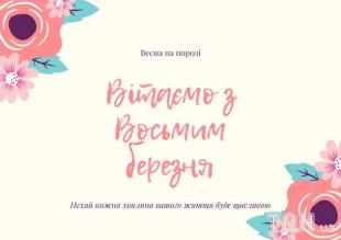 Вітаю зі святом весни, краси та жіночності! Нехай ваші мрії здійснюються легко, серце наповнюється теплом, а життя буде сповнене яскравих і приємних моментів. Будьте неповторними та щасливими завжди!