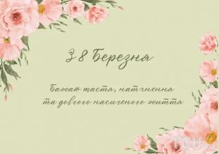 Дорогі жінки! Вітаю вас із Міжнародним жіночим днем! Нехай у вашому житті завжди буде світло радості, тепло любові та гармонія в серці. Бажаю здійснення мрій і щоденних маленьких чудес.