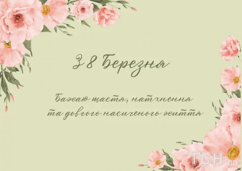 З 8 березня, жінки прекрасні, Хай буде життя ваше казково ясне. Нехай квіти мрій цвітуть у серці, А добробут і мир завжди поруч йдуть.