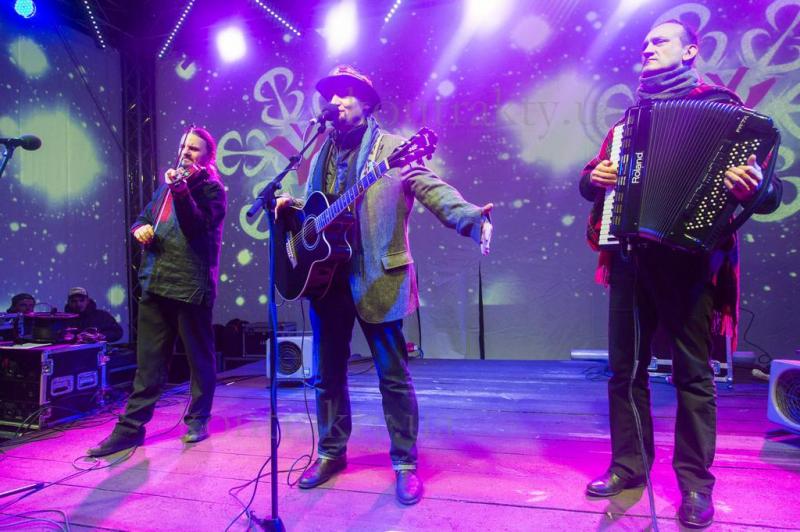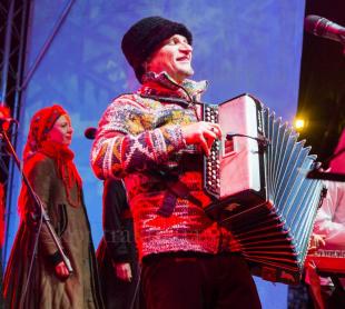 Кирилл Бородин скрипка, вокал (справа), Сергей «Фома» Фоменко гитара, вокал (по центру), Данил Денисов аккордеон, группа «Фома Мандрівник та Різдвяний оркестр» («Фома Путешественник и Рождественский оркестр»)